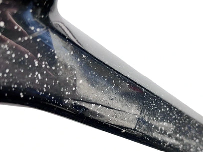 Raw carbon fiber topped with cream paint splatter and a high gloss clear-coat.